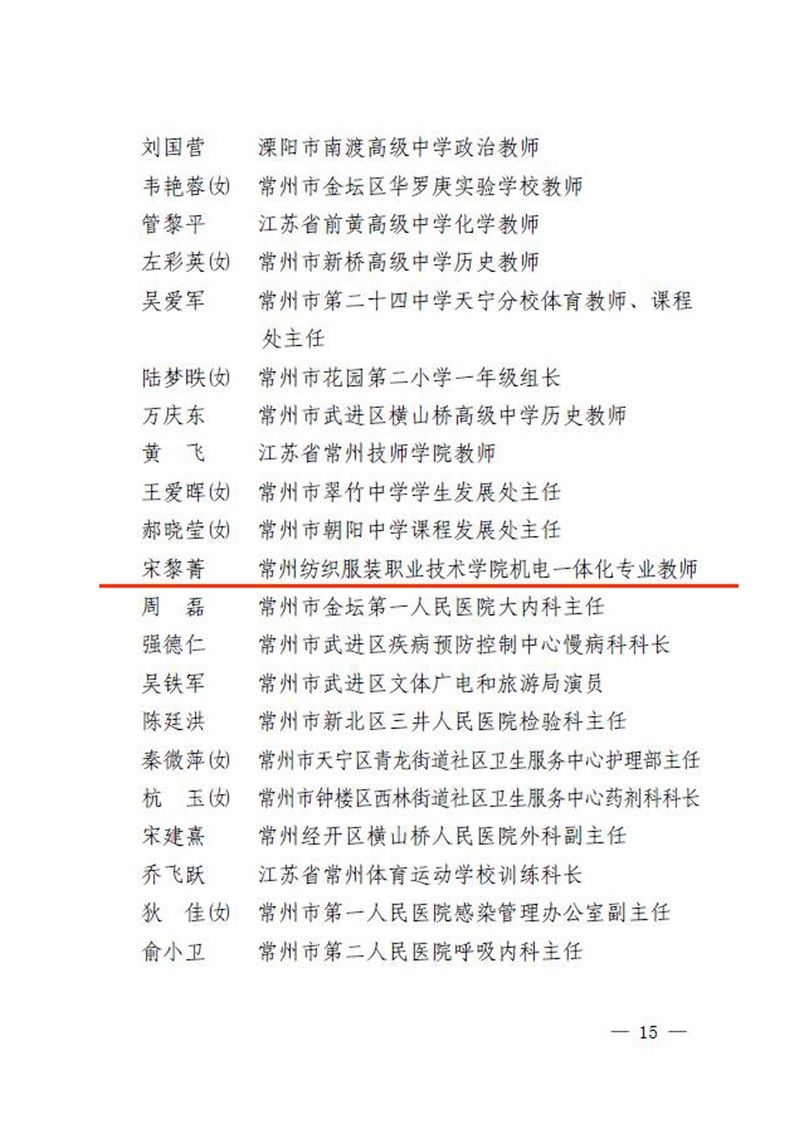 為表彰先進,樹(shù)立典型,弘揚(yáng)勞動精神,常州市總工會開展了2022年(nián)常州市五一勞動獎(jiǎng)和工人先鋒號評選活動(dòng),經過民主(zhǔ)推薦、層(céng)層評選,常州紡(fǎng)織服裝職業技術學院工會推薦的宋黎菁(jīng)老師被授予“常州市五一勞動獎(jiǎng)章”榮(róng)譽稱號,並於今近日發文表揚。