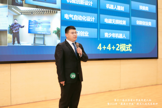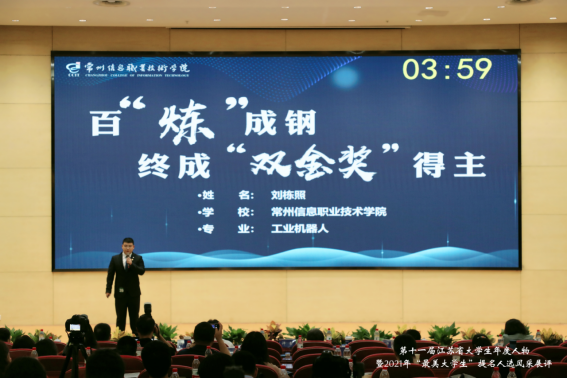 劉棟照聚焦“用工匠精神,實現技(jì)能報(bào)國”的人生(shēng)目標,通過樸實的語言,向(xiàng)現場評(píng)委和師生講述了自己“百煉成鋼,終成‘雙金獎’得主”的成長故事。他是“紅色先鋒”,創新“學黨史”宣講方(fāng)式,參與愛心公益活動(dòng)50餘次;他是“雙(shuāng)金獎”得主(zhǔ),第六屆中(zhōng)國國際“互聯網+”大學生創新創業大賽國賽、第十(shí)二屆“挑戰(zhàn)杯”中國大學(xué)生創(chuàng)業計劃競賽國(guó)賽均獲金獎;他是“專業學霸”,保持學分績(jì)點、班級和專業綜合排(pái)名第一,七項實用新型專利授權,獲國家勵誌獎(jiǎng)學金、江蘇省(shěng)優秀學(xué)生幹部、江蘇省(shěng)最美職(zhí)校生標兵等榮譽(yù)稱號。他以知促行、以行求知、創新進取(qǔ)的點滴,集中體現了常信學子(zǐ)沉穩靈動的品格特點,詮釋了高職學生的專業素養和勵誌奉獻的(de)家國情懷,獲(huò)得現場評委和(hé)同學們的一致認可。