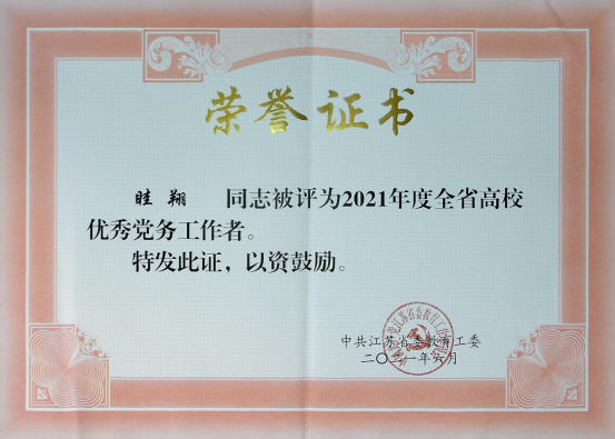 根據《省委教育工委關於表(biǎo)彰2021年度全省高校優秀共產黨員、優秀黨務工作者和先進基層黨組織的決定》(蘇委教組〔2021〕25號),我校智能裝備學院教師眭翔(xiáng)獲得2021年度江蘇省高校優秀黨務工作者榮譽稱號(hào)。