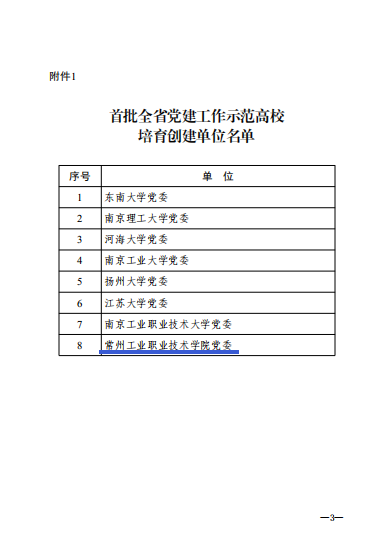 近日,江蘇省教育廳公布了新時代江蘇高校三級黨組織“強基創優”建設計劃首批遴選(xuǎn)結果,常州工業(yè)職(zhí)業技術學(xué)院入選“全省黨建(jiàn)工作示範高校”,成為江蘇省唯一入選的高職專(zhuān)科院校(xiào)。這是繼智能控製學院黨總支入選第三批“全國黨建工作標杆(gǎn)院係”培育創建單(dān)位(wèi)、旅遊與烹飪學院教師第一黨支部(bù)入選第三批“全(quán)國黨建工作樣板支部(bù)”培育創建單位之後,學校在基層黨組織建設方麵,取得的又一項重要成果。