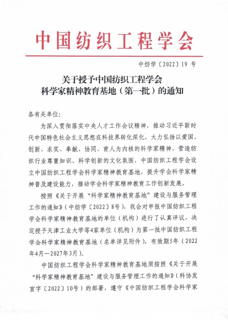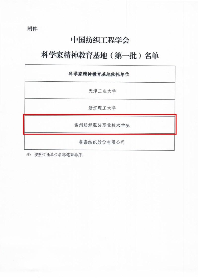 為深入貫徹落實中央人才工作會議精神,推(tuī)動習(xí)近(jìn)平新時代中國特(tè)色(sè)社會主義思想在科技界轉化深化。按照《關於開展“科(kē)學家精神教育基地”建設與(yǔ)服務管理工作的通知(zhī)》(中紡學〔2022〕8號)文件精神,常(cháng)州紡院組織了中國紡織工程(chéng)學會科學家精神教(jiāo)育(yù)基(jī)地的申報工(gōng)作,並成功獲得立項建設,第一批(pī)立項建設單位共4家,常州紡織服裝職業技術學院為獲得立項建設的唯一(yī)高職院(yuàn)。