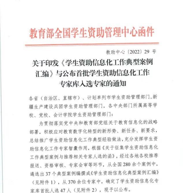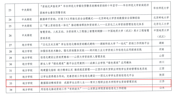 近日,教育部全國學生資助(zhù)管理中心下發《關於印發<學生(shēng)資助信息化工作典型案例匯編>與公布首批學生資助信息化工作專家庫入選專家的通知》(教助中心〔2022〕29號),常州工程職業技術學院《數據驅動精準(zhǔn)資助 成就(jiù)學生出彩人生》案例成功入選。經各地各校推薦報送、資格審核、專家會審等環節,北京(jīng)大學、清華大學等單位報送的37個案例(lì)入選,含5家高職院校,常州工(gōng)程學院報送案(àn)例係江蘇省高職院校唯一入選案例。