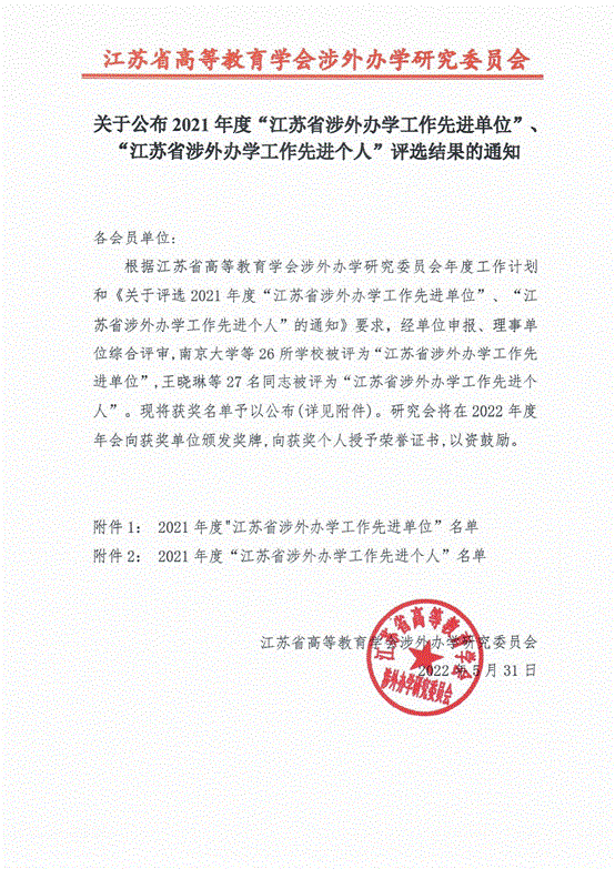 江蘇省高等教育學會涉外辦學研究委員會成立於2016年,由江蘇省教育廳主管,隸屬於江蘇(sū)省高等教育學會,是省內中外合作辦學機構和(hé)項目,各種(zhǒng)校際交流項(xiàng)目,各類境(jìng)外辦學(xué)交流的良好平台。