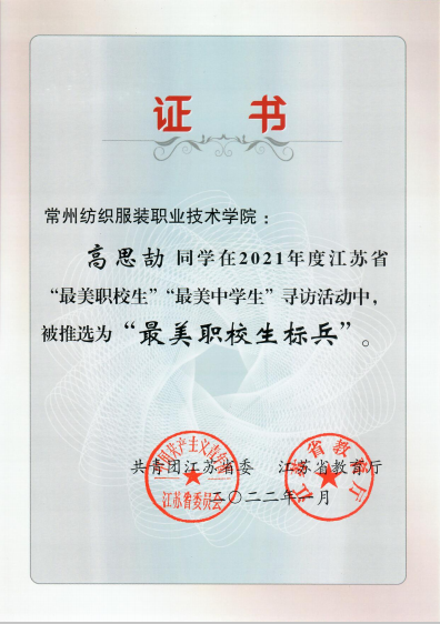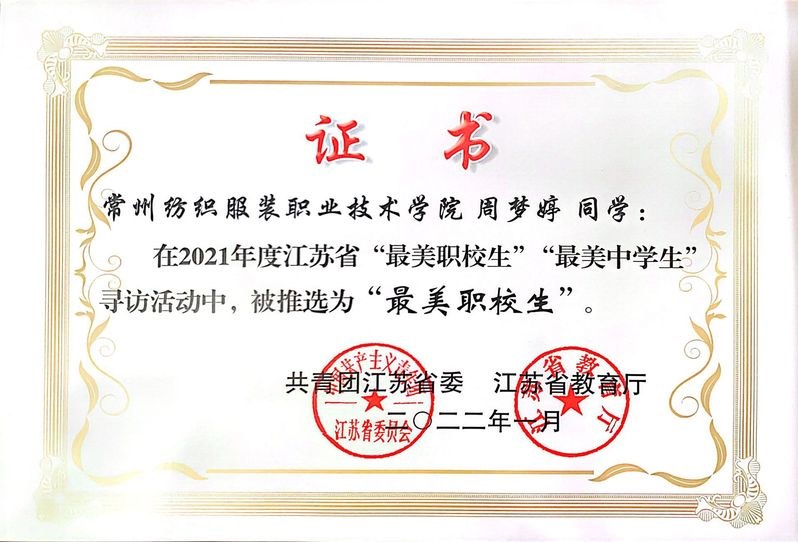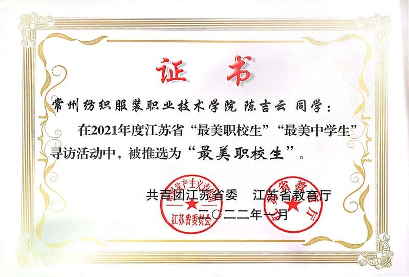 近日,由共青團江蘇省委、江蘇省教育廳共(gòng)同舉辦(bàn)的2021年度全省“最美職校生”尋訪活動結果(guǒ)揭曉,常州紡(fǎng)織服裝職業技(jì)術學院的服裝學院周(zhōu)夢婷、人文學院陳吉雲2名同學獲評“最美職校生”,機電學院高思劼同學獲得(dé)“最美職校生(shēng)標兵”稱號,這是學校學(xué)子(zǐ)連(lián)續第三年榮獲省級“最美職校標兵”榮譽稱號,也是學校落實“三全育人”的(de)成果。