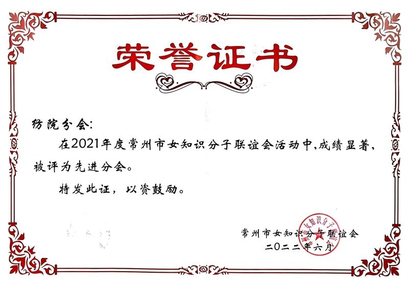 6月(yuè)22日下午,常州市女知聯總會召開“聚焦(jiāo)532 建功十四五”推進會暨2022年會,會議表彰了2021年度先(xiān)進分會、活動優秀組織(zhī)獎、優秀會員(yuán)和2019-2021年度“巾幗建功、科技興業”獲獎成果。常州紡織服裝職業技術學院的女知聯榮(róng)獲2021年度(dù)“先(xiān)進分會”榮譽稱號,10名會員被評為2021年度“優秀(xiù)會員”,獲評科(kē)技(jì)成果一等獎1項,論文一等獎15項。