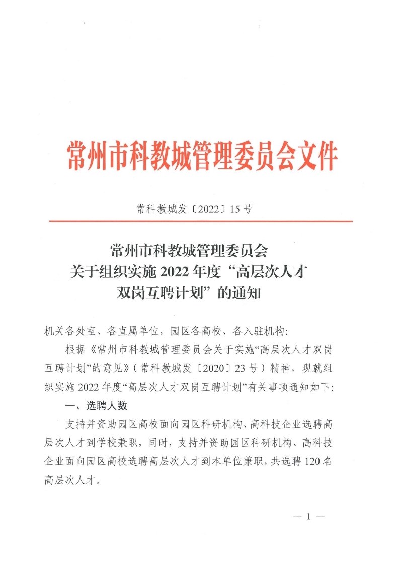 常州市科(kē)教城(chéng)管理(lǐ)委員會關於組織實施2022年(nián)度“高層次人才雙崗(gǎng)互聘計劃”的(de)通知