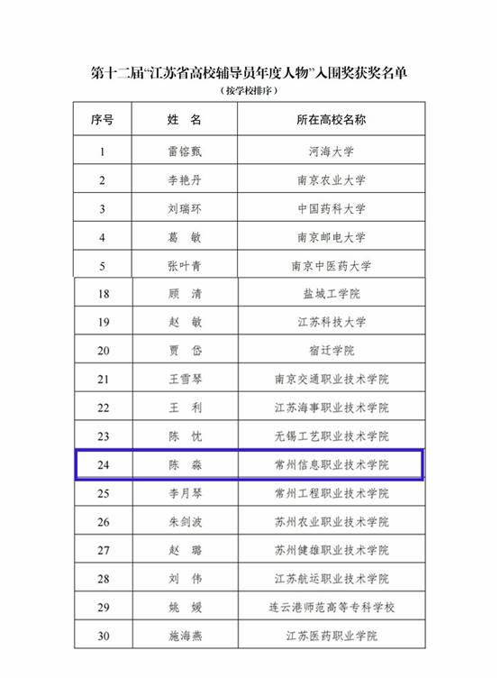 省委教(jiāo)育工委、省教育廳近日公(gōng)布了第(dì)十二屆“江蘇省(shěng)大學生年(nián)度人物和高校輔導(dǎo)員年度人物”暨2022年“最(zuì)美大學(xué)生”“最美高校輔導員”推選結果,常州信息職業(yè)技術學院軟件與大數據(jù)學院輔導員陳淼榮獲高校輔(fǔ)導(dǎo)員年度人物入圍獎(jiǎng),智(zhì)能裝備學院學生張娟榮獲(huò)年度(dù)大學生提名獎。