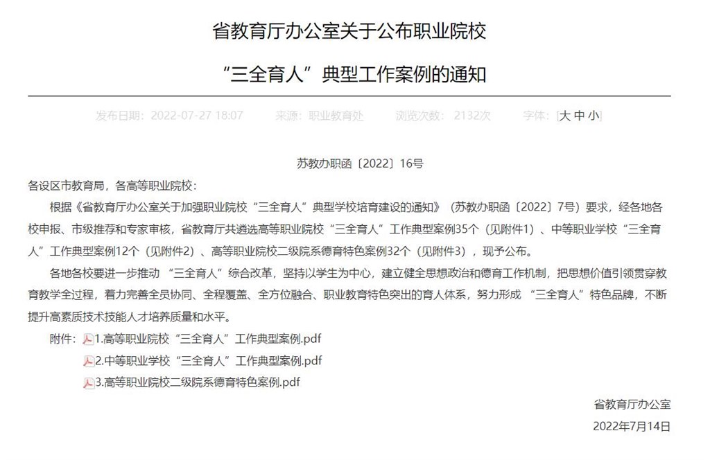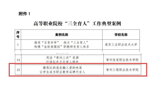 近日(rì),根據《省教育廳辦公(gōng)室關於公(gōng)布職業院校“三全育人”典型工作案例的通(tōng)知》(蘇教辦(bàn)職函〔2022〕16號),常州工程職業技術學(xué)院申報的題為《擦(cā)亮紅(hóng)的底色 融入愛的味道 讓學生成為職業教育品牌代言人(rén)》工作案例,經專家評審,被遴選為高等職業院校(xiào)“三全育人”工作(zuò)典型案例,省教育廳此次共(gòng)遴選高等職業院校“三全育人(rén)”工作典(diǎn)型案例35個。