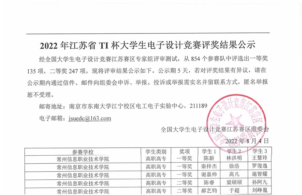 2022年江(jiāng)蘇省大學生電子設計競賽於7月27日至7月30日舉行。根據組委(wěi)會消息,常州信息職業技術學院12支參(cān)賽(sài)隊伍斬獲一等獎3項、二等獎2項共計5個獎(jiǎng)項。