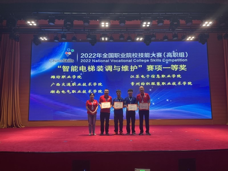8月18日—21日,2022年全國職業院校技能大賽智能(néng)電梯裝調(diào)與維護賽項國(guó)賽在山東濰坊職業學院順(shùn)利召開,全國27個省市共計51支隊(duì)伍參賽,常州紡織服裝職(zhí)業技術(shù)學院代(dài)表隊在機電學院肖海慧院長、嚴綱書記、劉宏(hóng)泉副(fù)院長的帶領下(xià)代表江(jiāng)蘇省參賽。經過2天(tiān)比賽的激烈角逐,崔雲瀟、張歡兩位選手(shǒu)在機電學院宋黎菁、師帥老師的指導下,發揮出了優良的職業(yè)素養(yǎng)和技術技(jì)能水平,在高手如(rú)林的全國強隊中,以排名第4的優異成績榮獲該(gāi)項目一等獎。