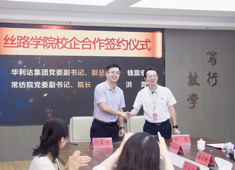 隨後,在參會人員(yuán)見(jiàn)證下,錢震宏和洪霄簽(qiān)署了(le)絲路學院校企合作協議,錢震(zhèn)宏、吳訪升、趙瑋晶、杜(dù)麗萍總經理共同為絲路學院揭牌。