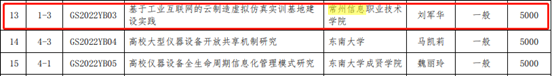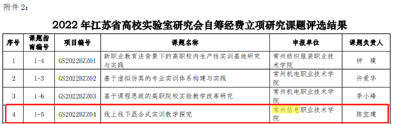 同時,學校智能裝備學院劉軍華(huá)老師《基於(yú)工業互聯網(wǎng)的雲(yún)製造虛擬仿真實訓基(jī)地建設實踐》課題和電子工程(chéng)學院陳宜建老(lǎo)師《線上線下混合式實(shí)訓教(jiāo)學探究》課題(tí)入選2022年江蘇省高(gāo)校實驗室研究會立項資助(zhù)研究課(kè)題。