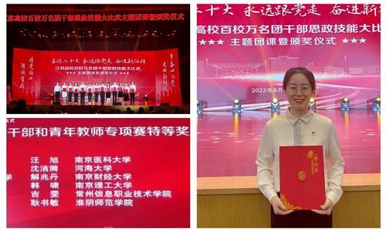 日前,“喜迎二十(shí)大、永遠跟黨走、奮(fèn)進新征程”江(jiāng)蘇高校百校萬名(míng)團幹部思政(zhèng)技能大比武(wǔ)結果揭曉。常州信息職業技術學院青年教(jiāo)師吉雯獲(huò)青年教師專項賽特等獎,為常州高校唯一獲此獎項的青年教師,省內僅有二所(suǒ)高職獲此賽道特等獎。青年教師朱逸飛獲青(qīng)年教師專項賽三等獎,我校數字經濟學院團支部書記李鈺龍(lóng)獲團支部書記專項賽三等獎。