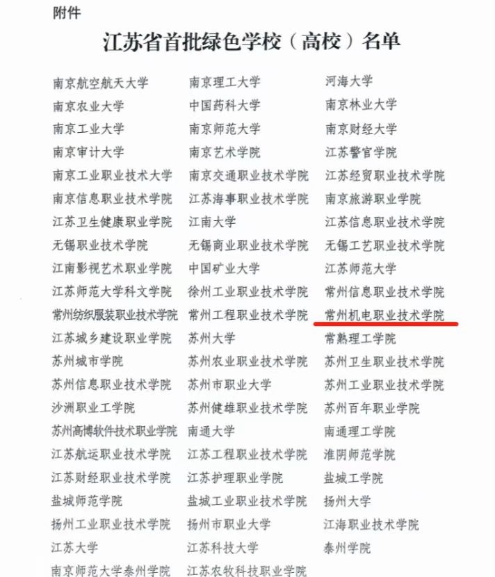 近日,省教育廳、省發改委等(děng)四(sì)部門發布《省教育廳等四部門關於公布首批江蘇省綠色學校(高校)名單的通知》(蘇教發函〔2022〕74號),常州機電職業技術學院獲(huò)批首批(pī)江蘇省綠(lǜ)色學校(高校)榮譽稱號。