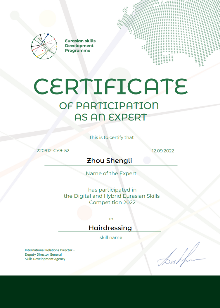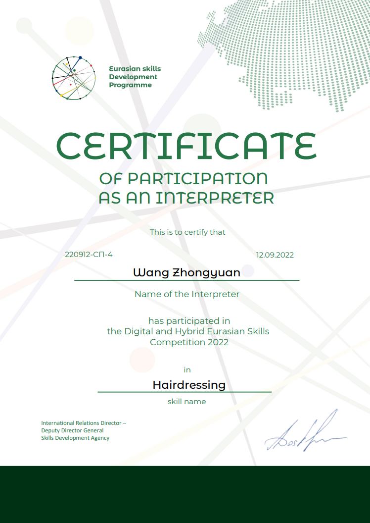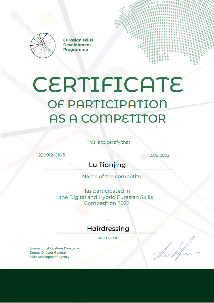 9月8-12日,2022(俄羅斯(sī))金磚+歐亞技能遠程國際賽線上賽和線下賽同時舉(jǔ)行。常(cháng)州紡(fǎng)織服裝職業技術學(xué)院服裝學院形象213A魯天京同學(xué)參與該賽事的“美發”賽項(xiàng),並獲得線(xiàn)上賽總分(fèn)第三名的好成績。