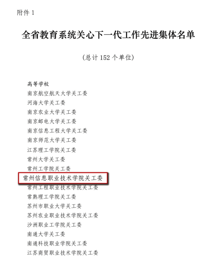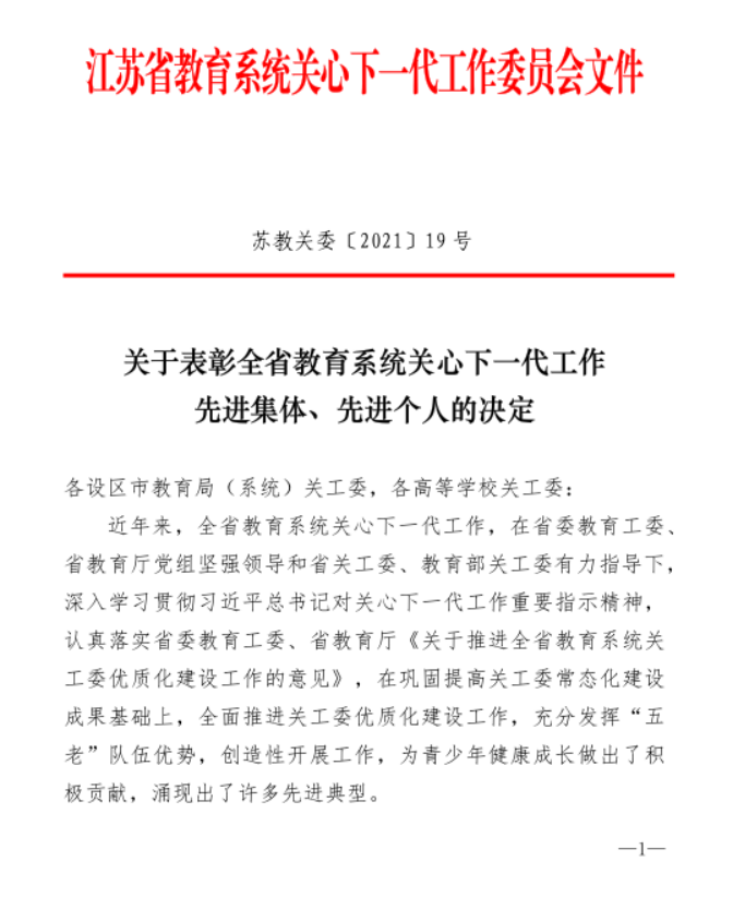 近日,江蘇省教育係統關心(xīn)下一代工作委員會於下發《關於表彰全省教(jiāo)育係統關心下一代工作先進集(jí)體、先進個人(rén)的決定》(蘇教關委〔2021〕19號)文件,我校關工委榮獲江(jiāng)蘇省教育係(xì)統關心下一代工作先(xiān)進集(jí)體榮譽稱號。