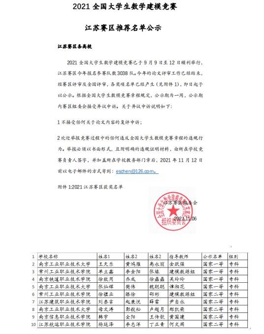 全國大學生數學建模競賽創辦於1992年(nián),每年一屆,是首批列入“高校學科競(jìng)賽排行榜”的競賽之一,已成為國內外具有重要影響力的基礎(chǔ)性學科競賽。本(běn)次大賽,江蘇省數學建模競賽組委(wěi)會組織專家評委在省一等獎優秀作品中(zhōng)經過嚴格評審篩選出9個優秀作品,向(xiàng)全國數學建模競(jìng)賽組委會推薦了4個國家一等獎和5個國家二等獎,這9個參賽作品代表江蘇省參(cān)加全國評審,和其他省份組(zǔ)委會推薦的優秀作品一決高(gāo)下。經(jīng)過全國評審專家的嚴(yán)格評審,我校的參賽作品在全國評審中脫(tuō)穎(yǐng)而出,榮(róng)獲了全國一等獎和二等獎各一項,此項(xiàng)賽事競爭異常激烈,能獲得(dé)全國一等獎和(hé)二等獎實屬不易。