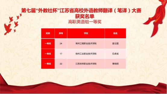 11月26-27日,由江蘇省翻譯協會、江蘇省高等學(xué)校外國語教學研究會和上海外語教育出版社聯合舉辦的第七屆“外教社杯”江蘇省高校外語教師翻譯(筆譯)大賽成功舉行。我校通識教育教學(xué)部英語教師婁立國(guó)以第一名的成績斬獲高職組一等獎。此為今年該賽項最高(gāo)獎項,也是婁立國老師繼2020年在該賽事獲得“特等獎”之後第二次摘得該賽事最高獎項。