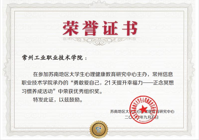 近日,在蘇南地區大學生心理健康教育(yù)研究中心開展的“勇敢愛自己,21天提升幸福力——正念(niàn)冥想習慣(guàn)養成活動”中,常州工業職業技術學院榮獲優秀組織獎。