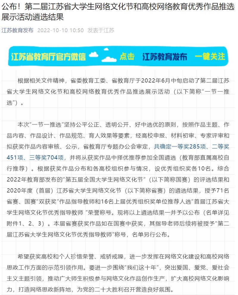本(běn)屆江蘇省大(dà)學生網絡文化節和高校網(wǎng)絡教育優秀作品推選展示活動自2022年6月啟(qǐ)動,以“爭做校園好網民(mín),凝聚(jù)網絡正能量,青春獻禮二十(shí)大”為主題,麵向高校師生征(zhēng)集作品,“大學生網絡文化(huà)節”征集微視頻、微電(diàn)影、動漫、攝影、網文(wén)、公益(yì)廣告、音頻、校園歌曲、其他類網絡創新作品等9類(lèi)作品,“高校網絡教育優秀作品推選”征集優(yōu)秀網絡文章、優秀工作案例(lì)、優秀微課、優秀(xiù)新媒體作品等4類作品。學(xué)校積極響應,精心策劃,廣泛發(fā)動收集(jí)優秀網(wǎng)絡作品。經過校內遴選,共推薦36件師生作品參與線上統一(yī)申報(bào)。