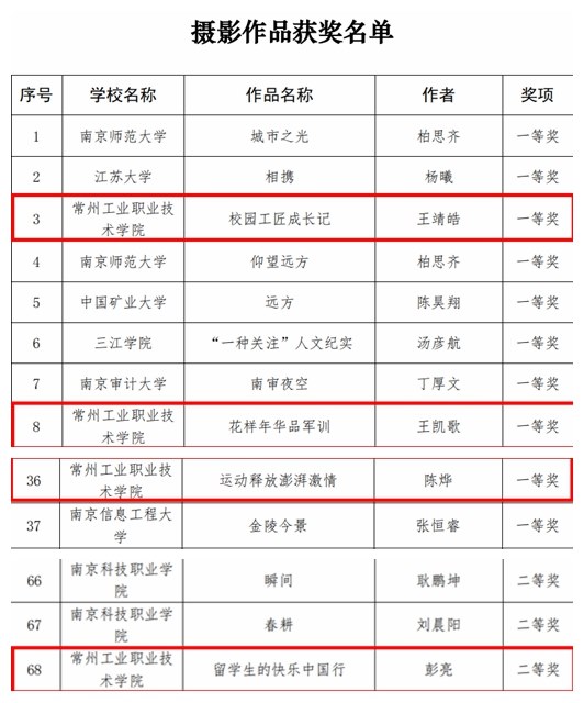 近日,省委教育工委、省教育廳公布了第二屆江蘇(sū)省大學生網絡文化節(jiē)和高校網絡教育優秀作品推選展(zhǎn)示活動的遴選結果,常州工業職業技術(shù)學院經貿管理學院選送的學生作品獲攝影類賽項一等獎3項二等獎1項,現(xiàn)代裝備製造學院(yuàn)選(xuǎn)送的學生作品榮獲(huò)其(qí)他類網絡創新作品(pǐn)賽項二(èr)等獎1項三等獎1項。其中,3項一(yī)等(děng)獎作品和2項二等獎作(zuò)品也入(rù)圍國賽,實現了學校生作品此類比(bǐ)賽(sài)的新(xīn)突破。