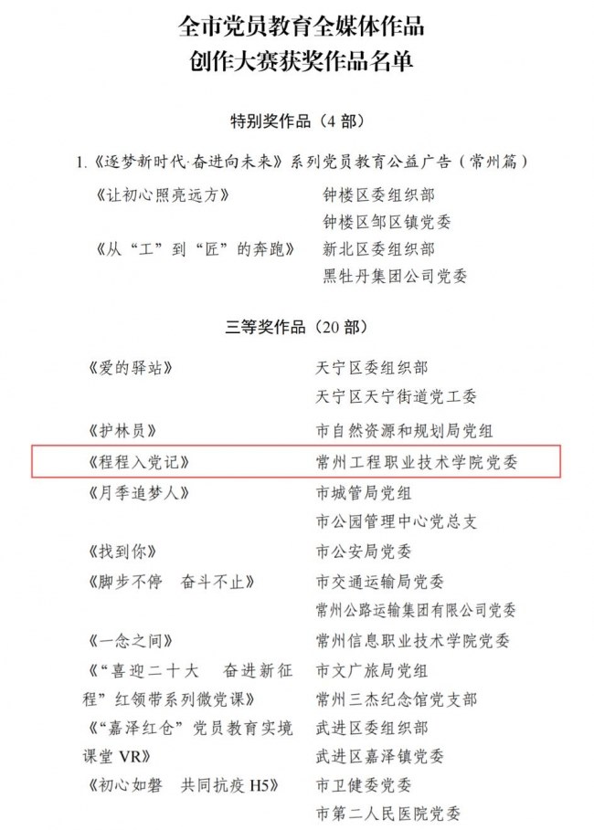 常州工程職業技術學院推送的作品在常州(zhōu)市黨員(yuán)教育(yù)全媒體作品創作大賽中獲獎