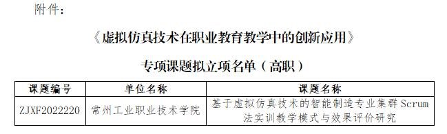 近日,教育部科技發展中心公布(bù)了2022年度《虛擬仿真技術在職業(yè)教育教學中的創新應用》專項課題名(míng)單,常州工業職業技術學院獲教(jiāo)育部高等學(xué)校科學(xué)研究發展中心《虛擬仿真技術在職業教育教學(xué)中的創(chuàng)新應用》專項課題立項。