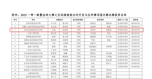 11月15日,2022一帶一路暨金磚國家技能發展與技術創新大賽區塊鏈智能合約開發與應用(yòng)賽項以線上(shàng)線下並行的方式舉行,來自全國47所高校的47支隊伍展(zhǎn)開角逐。常(cháng)州信息職業技術學院的軟件與大數(shù)據學院尤國紅(hóng)、周建美老師指導(dǎo)的馮嘉琪、李聚源(yuán)同學在比賽中以優異成績獲得比賽一等獎。