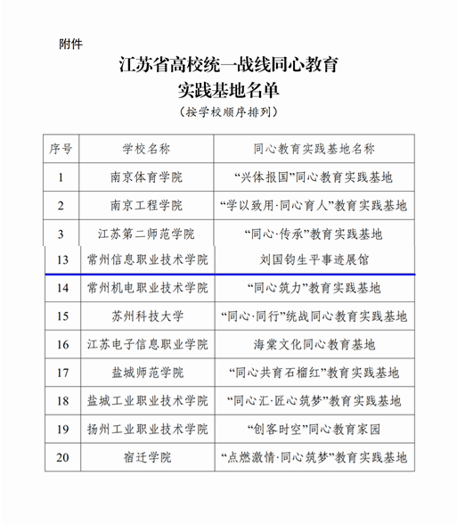 近日,省(shěng)委教育工委公布了2022年江蘇(sū)省高校統一戰線同心教育實踐基地名(míng)單,常州信息職業技術學(xué)院劉國鈞(jun1)生平事跡(jì)展館獲評(píng)“江蘇省高校統一戰(zhàn)線同心教育實踐基地”。