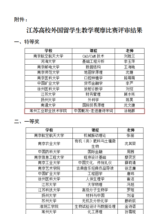 近日,從江蘇省高等(děng)教育學會外(wài)國留學生教育管理研究(jiū)委員會(huì)傳(chuán)來喜訊,常州工業職業技術學院教師塗豔群在(zài)江蘇高校外國留學生教學觀摩比賽中榮獲特等獎。
