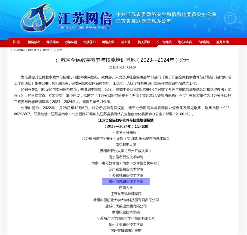 近日,江蘇省江蘇省互聯網信息辦公室官網公布了(le)江蘇(sū)省全民數字素養與技能培(péi)訓基地(2023—2024年)公示名單,常州信息職業(yè)技術學院入選公示名單。
