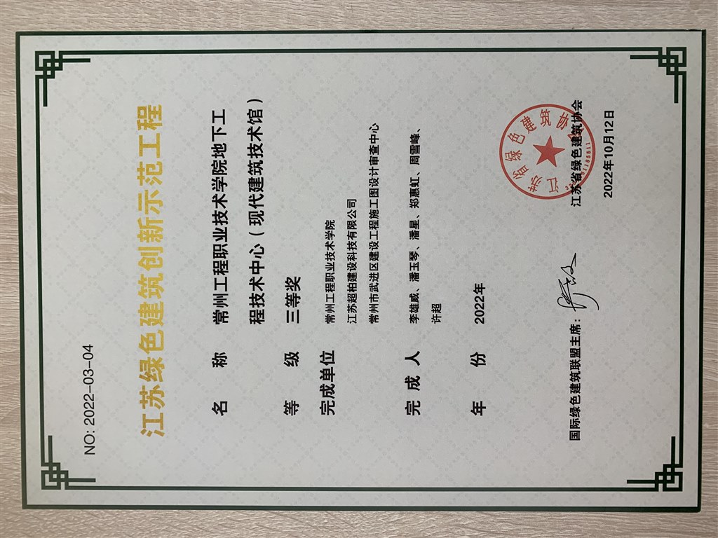 近日,國際綠色(sè)建築聯盟聯合江蘇省綠色建築協會組織2022年度江蘇綠色建築創新示範工程評選(xuǎn),由黨委副書記、校長李雄威(wēi)和黨委委員、副(fù)校長潘(pān)玉琴領(lǐng)銜申報的常州工程職業(yè)技術學(xué)院現代建築技術館項目獲獎(jiǎng)。