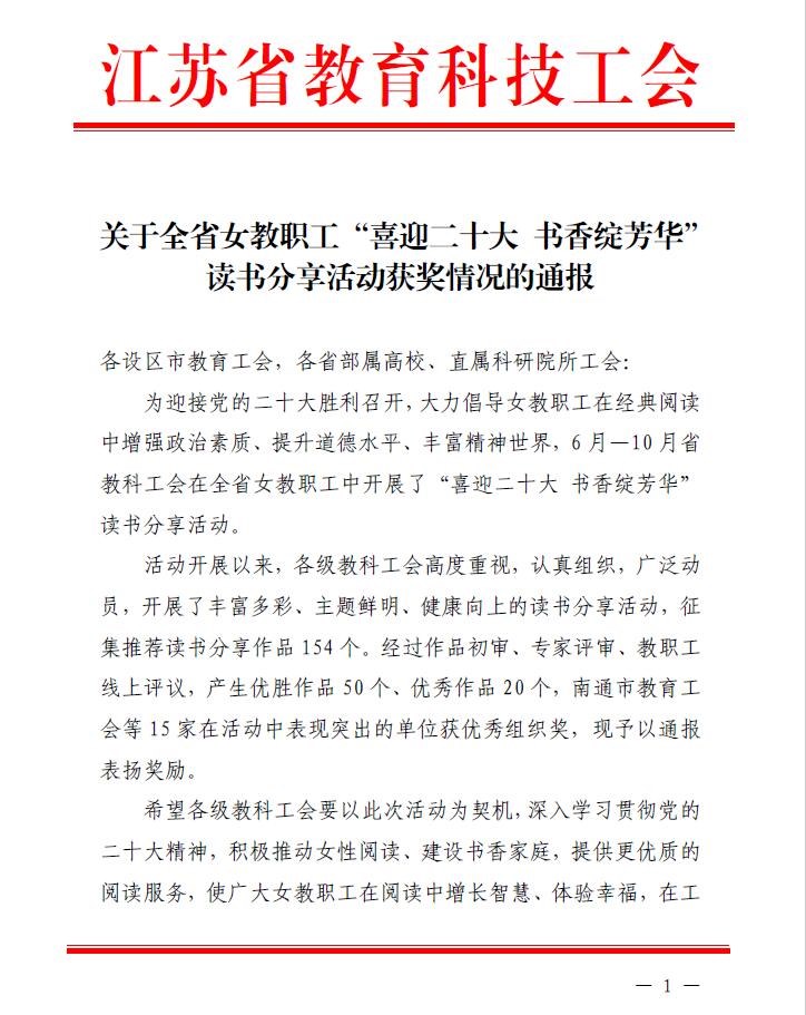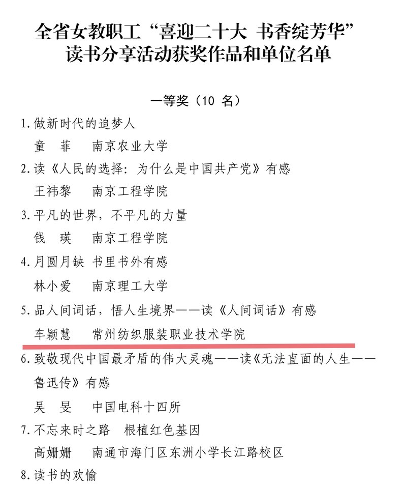 為迎接(jiē)黨的二十大勝利(lì)召開,大力倡導女教職工在經典(diǎn)閱讀中增強政治素質、提升(shēng)道德水平、豐富精神世(shì)界,積極(jí)營造(zào)愛讀書、讀好書、善(shàn)讀書的濃(nóng)厚氛圍。江蘇省教育(yù)科技工會在全省女教職工中開展了“喜迎二十大(dà) 書香綻芳華” 讀書分享活動,本次活動從6 月(yuè)—10 月,在全省征集推薦讀書分享作品 154 個。經過作品初審、專家評審、教職工線上評議(yì),產生優勝作(zuò)品 50 個、優秀作品 20 個(gè)。常州紡織服(fú)裝(zhuāng)職業技術學(xué)院車穎(yǐng)慧老(lǎo)師的作品“品人間詞話,悟人生境界——讀《人間詞話>》有感”在本次(cì)讀書分享(xiǎng)活動中經過層層評審,榮獲一等獎。