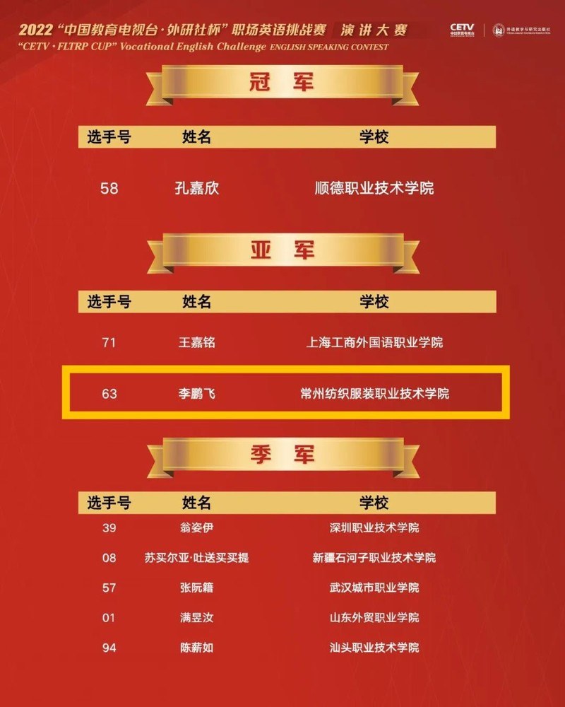 12月18日,2022“中國教育電視台·外研社杯”職場英語挑戰賽演講大賽全國總決賽落下(xià)帷幕。經過(guò)和(hé)來自全國28個省、市、自治區的百名優秀選手同(tóng)台競技、激烈角逐,常(cháng)州紡織服裝職業技術學院的人文學院2021級學生李鵬飛脫穎而出,榮獲全國特等獎亞軍,展現了常紡學子風采,為學校贏得(dé)了榮譽。