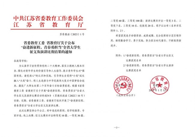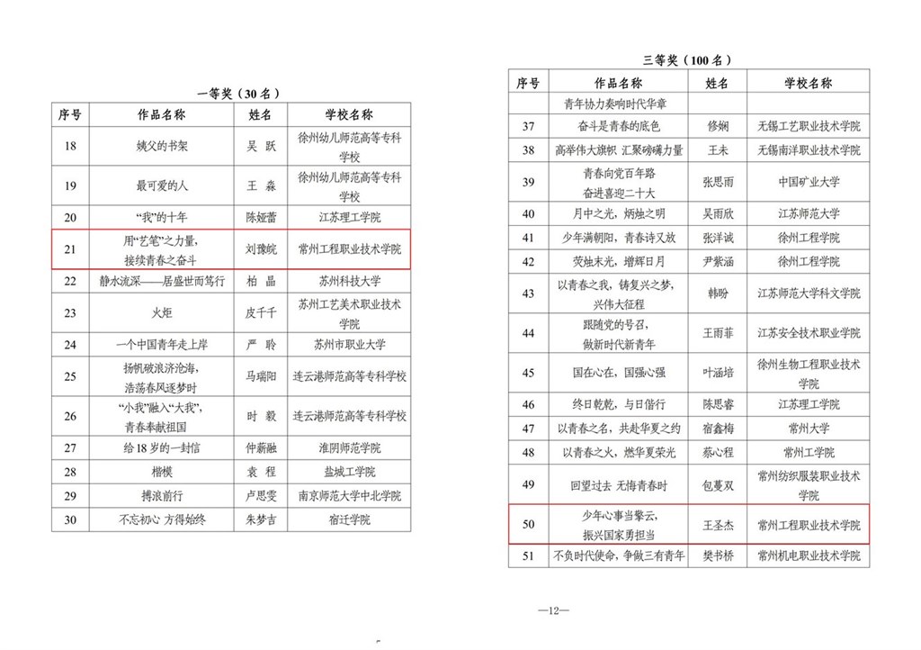 近(jìn)日,省委教育工委、省教育廳公布“奮進新(xīn)征程,青春勇擔當(dāng)”全省大學生(shēng)征文比賽結果(guǒ),常州工程職業技術學院設計(jì)藝術學院劉豫皖同學作品《用(yòng)“藝筆”之力量,接(jiē)續青春(chūn)之奮鬥》榮獲一等獎,經濟管理學院王聖傑同學作品《少年心事當擎雲,振(zhèn)興國家勇(yǒng)擔當》榮獲三等獎。