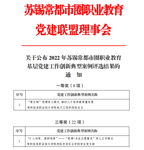 常州信息職(zhí)業技術學院兩(liǎng)個案例分獲2022年蘇錫常都市圈職業教育基層黨建工作創新典型案(àn)例一等獎、三等獎(jiǎng)