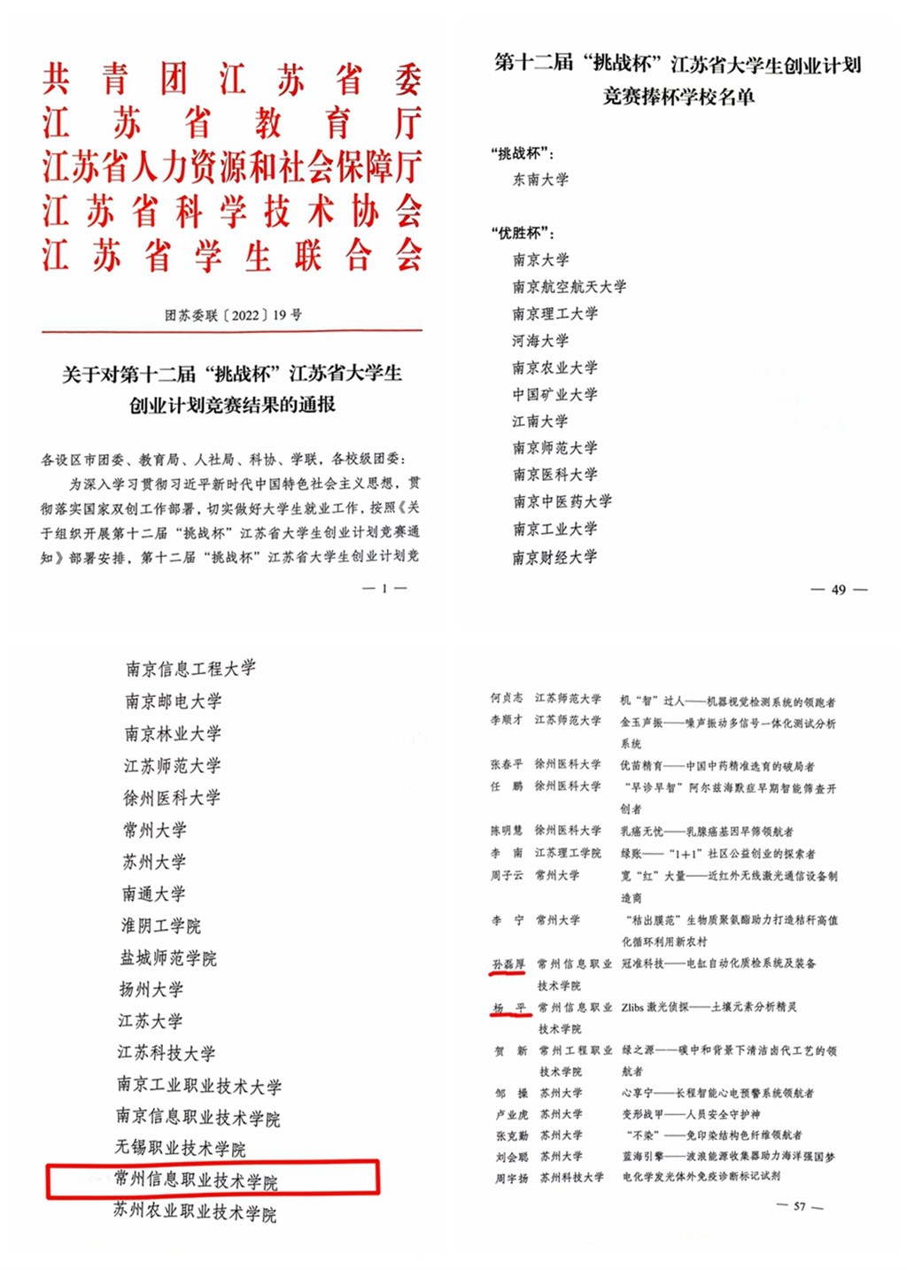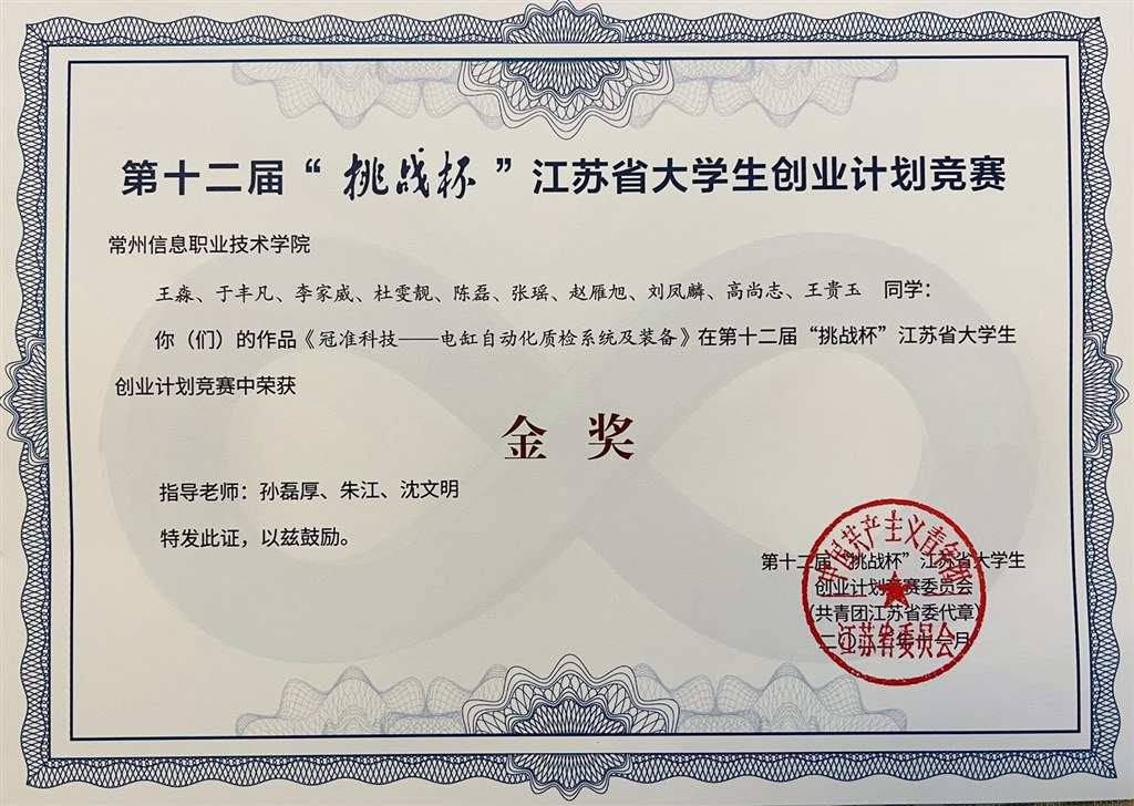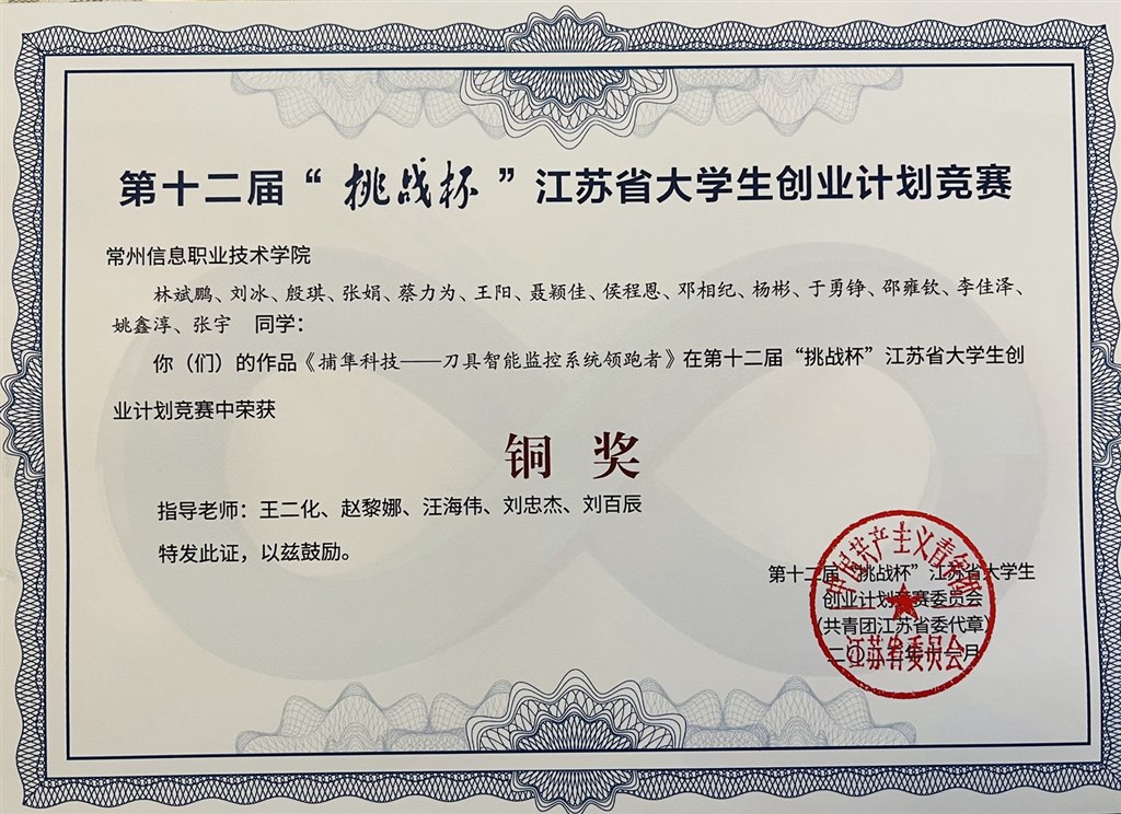 日前,共青團江蘇省委、江(jiāng)蘇省(shěng)教育廳、江(jiāng)蘇(sū)省人(rén)力資源和社會保障廳、江蘇省科學技術協會、江蘇省(shěng)學(xué)生聯合會(huì)聯合發文《關於對第十二屆“挑戰杯”江蘇省大學生創業計劃競賽結果的通報》(團蘇委聯〔2022〕19號),常(cháng)州信息職業技術學院獲“優勝杯(bēi)”,2個項目獲金獎,1個項目獲銅獎,楊平、孫磊厚兩位老師獲“優秀指導教師”稱號。