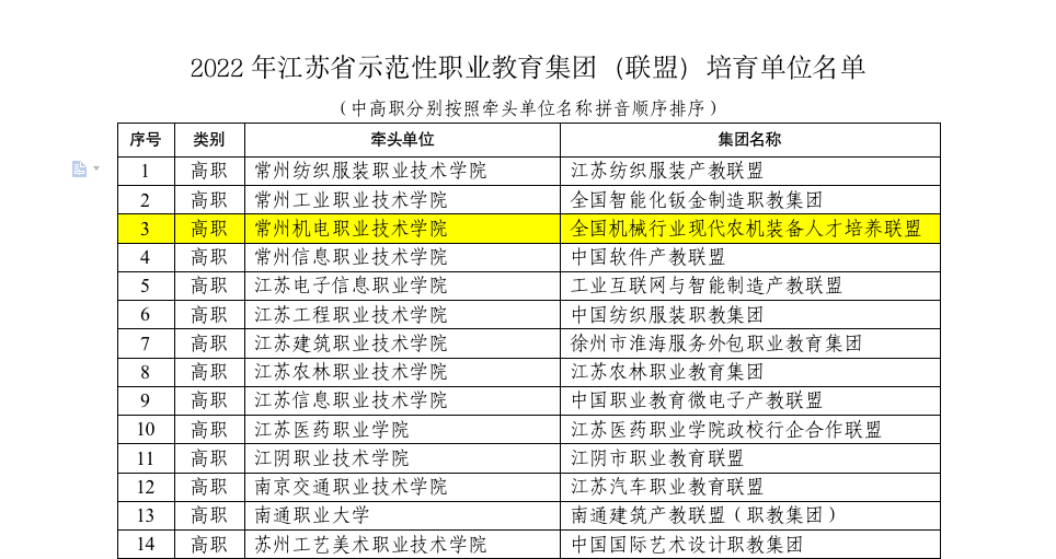 近日,江蘇省教育廳(tīng)公布了江蘇省示(shì)範性職(zhí)業教育集團(聯盟)培育單位名單,常州機電職(zhí)業技術學院牽頭建設的全國機械行業現代農機裝備人才培養聯盟成功入選。