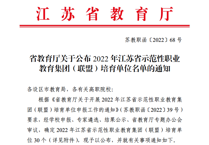 江蘇省示(shì)範性職業教育集團(聯盟)培育工作是江蘇省(shěng)深入貫徹落實黨中央(yāng)關於職業教育工作的決策部(bù)署(shǔ)和習近平總書記關於職業教育重要講(jiǎng)話精神,持續推進現代(dài)職業(yè)教育體係(xì)建設改革,優化職業教育類型定(dìng)位,推動職業教育高質量(liàng)發展的舉措之一。本次共有30個職教集團入選江蘇省(shěng)示範性職業教育集團(聯盟)培育單位。