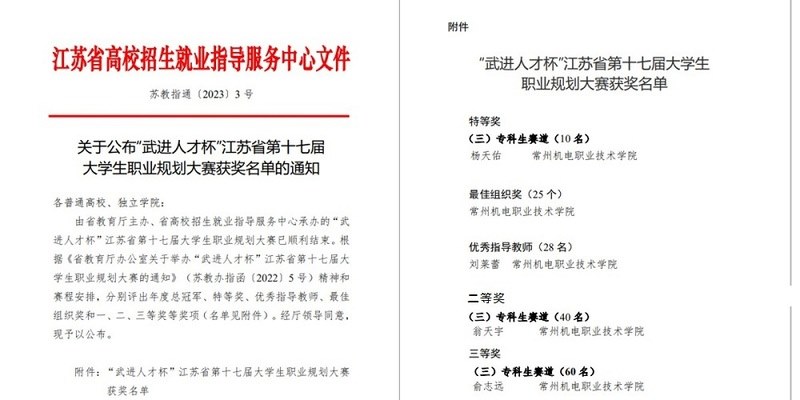 近日,由江蘇省教育廳主辦、省高校招生就業指導服務中心(xīn)承辦的“武進人才杯(bēi)”江蘇省第十七屆大學生職業規劃大(dà)賽總決賽落下帷幕。常州機電職業技術學院信息(xī)工程學院人(rén)工智能2031班學生楊天佑(指導(dǎo)老師:劉萊蕾)獲專科生賽道特等獎,電氣工程學院機器人2032班學生翁天宇(yǔ)(指導老師:王雲霞)獲二等獎,交通工程學院汽車營銷2131班學生俞誌遠(指導老師:沈俊)獲三等獎(jiǎng)。學校獲“最佳組織獎”,教師劉萊蕾獲“優秀指導教師獎”。