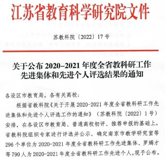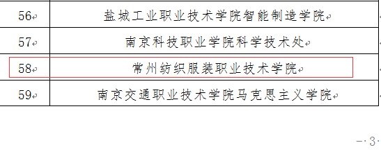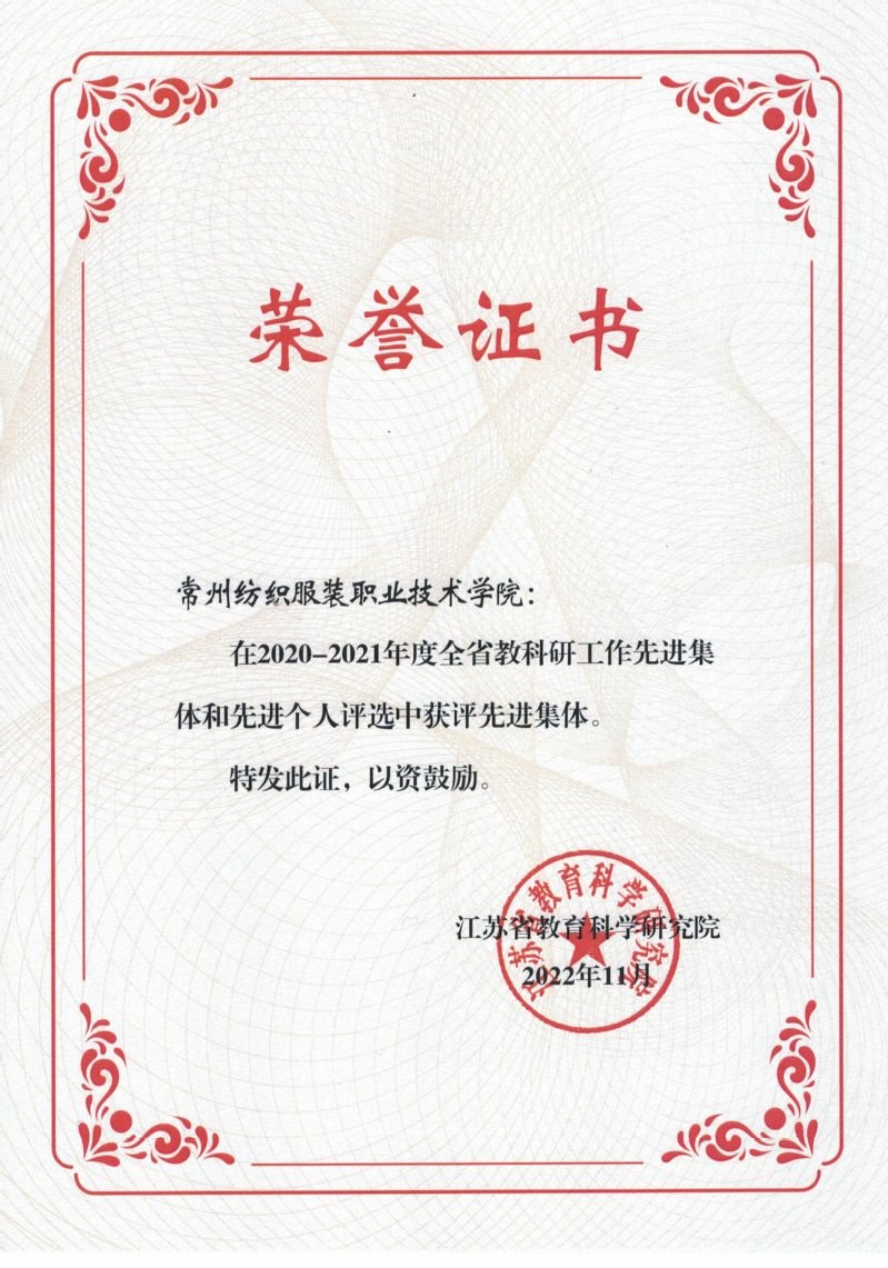 2022年6月12日,江蘇省教育科學研究院發布了《關於公布2020-2021年度全省教(jiāo)科研工作先進集體和先進個人評選結果的通知》,常州紡織服(fú)裝(zhuāng)職業技術學院獲評“教科研工作先進集體”。