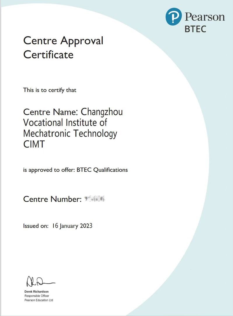 近日(rì),常州機電職業(yè)技術(shù)學院(yuàn)收到培生教育集團(Pearson)BTEC認證中心授權證書,此次獲得授權的是Pearson BTEC 4級高級國家(jiā)商業證書,由經濟管理學院與國際教育學院共同負責中心的日常運(yùn)營工作。我校為江蘇省唯一一所(suǒ)獲得BTEC認證中心商業證書授權的高校。