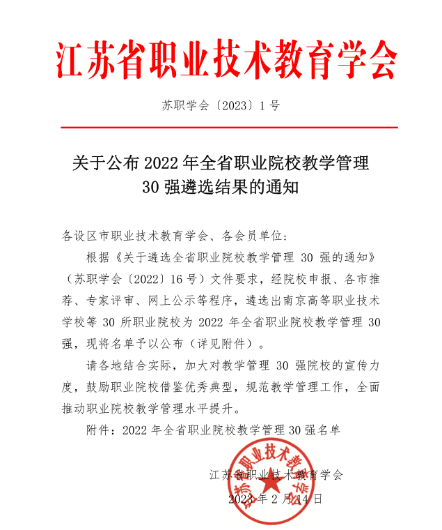 2月14日,江蘇省職業技術教育學會發布了《關於公布2022年全(quán)省職業院校教學管理30強(qiáng)遴選結果的通知》(蘇職學會〔2023〕1號),常州信息職業技(jì)術學院榮獲(huò)2022年全省職業院校教學管理(lǐ)30強。