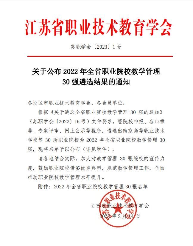 2月14日,江蘇省職業技術教育學(xué)會公布了2022年全省職業院校教學管理(lǐ)30 強遴選結果,常州機電職業技術學院成功入選30強名單。