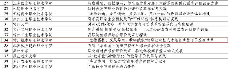 近(jìn)日(rì),省(shěng)教育廳發布《省教育廳辦公室關於公(gōng)布2022年教育評價改革試點項目的通知》,常州機電(diàn)職業技術(shù)學(xué)院《“立(lì)德強(qiáng)技、成果導向、數字賦能”的(de)職(zhí)業院(yuàn)校人(rén)才培養質量評價綜合(hé)改革》入選2022年江蘇(sū)省教育評價(jià)改革試(shì)點項目。