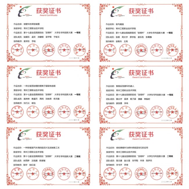 近日,由中國發明協會聯合山東省教育廳、人社廳、科技廳(tīng)主辦的第十(shí)七屆全國高職院校“發明杯”大學生專利創新大賽結果(guǒ)揭曉。常州工程職業技術學院參(cān)賽項目獲全國一等獎4項、二(èr)等獎2項。