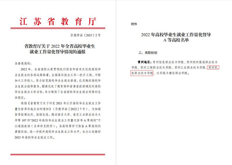 近日,江蘇省(shěng)教育廳印發《省教育廳關於(yú) 2022 年全省(shěng)高校畢(bì)業(yè)生(shēng)就業工作量化督(dū)導情(qíng)況的通報》(蘇教(jiāo)學(xué)函〔2023〕2 號),常州機電職業技(jì)術(shù)學院連續第(dì)三年獲評全省高校畢業生就業工作量化督導A等高校榮譽。