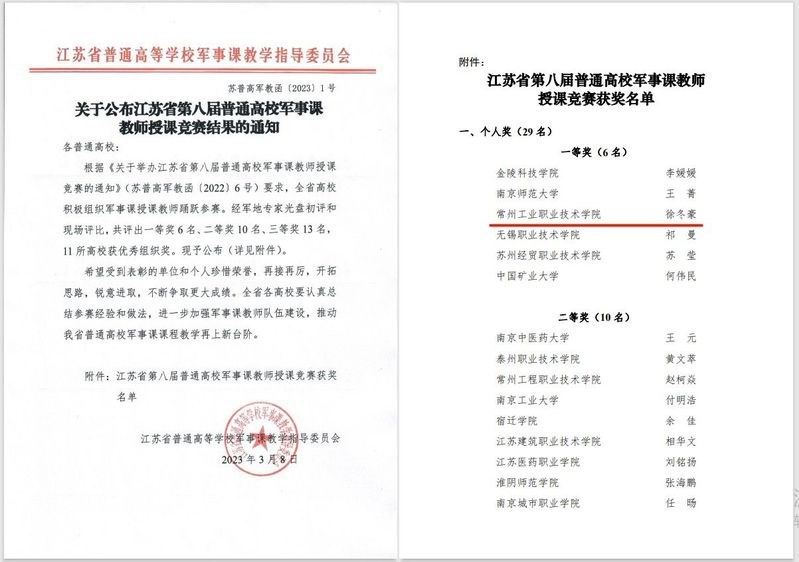 常州工業職業技術學院在江(jiāng)蘇省(shěng)第八屆(jiè)普通高校軍事(shì)課教師授課競賽(sài)中榮獲(huò)一等(děng)獎