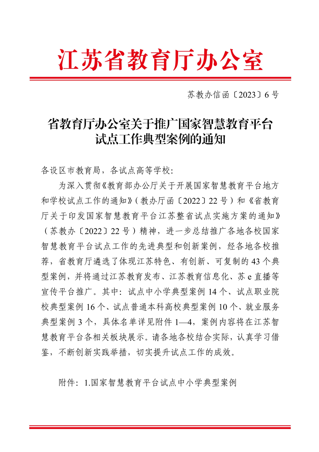 江蘇省教育廳公布了(le)《省教育廳辦公室關於推廣國家智慧教育平台試點工作典型案例的通知》(蘇教辦信函〔2023〕6 號),常州機電職業技術(shù)學院報送的《六維共舉 虛實(shí)結合 助力智(zhì)能製造技術技能人才培(péi)養》入選典型案例項目(mù)名單。