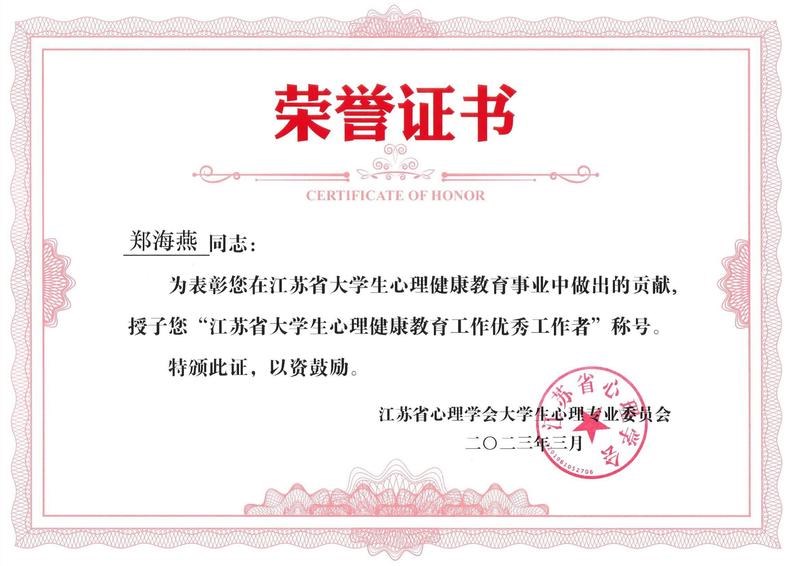 3月(yuè)17日至19日,江蘇省心(xīn)理學會大學生專業委員會學術年會在(zài)常熟理工學院舉行,會上對江蘇省高校心理服務體係建設先進工作(zuò)者和優秀心(xīn)理委員(yuán)進行了(le)現場頒獎(jiǎng)。全省168所本專科院校共48位老師被評選為“優秀工作者”,28位同學被評選為(wéi)“優秀心理(lǐ)委員”,常州工業職業技術學院的鄭海燕老師獲評“優秀工作(zuò)者”,楊番同學獲評“優秀心理委(wěi)員”。